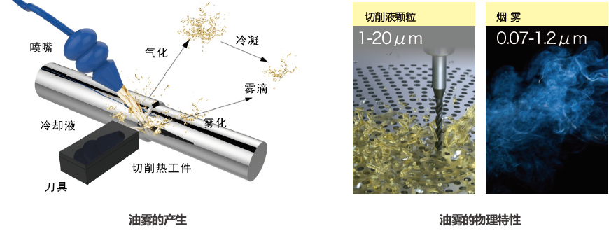 ⾼速、超⾼速数控机床⼯作时会产⽣⼤量的切削热,⽽冷却的切削液遇到⾼温和⾼速旋转的⾦属零件和⼑具时候汽化雾化,从⽽引起油雾的产⽣。
