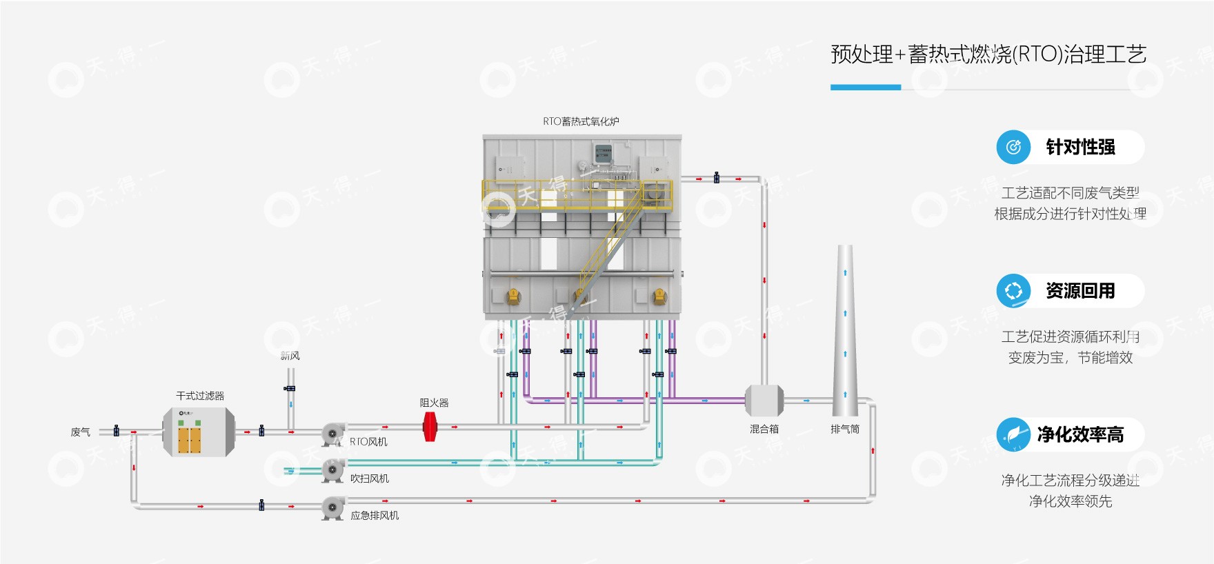 推荐治理方案:预处理 + 吸附浓缩 + 脱附再生 + 蓄热式燃烧(RTO),首先对废气进行针对性预处理,去除其中的颗粒物与水汽,确保后续系统稳定运行;采用定制化的活性炭或分子筛复合吸附材料,高效捕集各工序分散产生的低浓度 VOCs,实现废气的有效浓缩;吸附饱和后,系统通过精准控制的热空气进行脱附,将低浓度废气转化为小风量、高浓度的有机气流。该气流随后导入蓄热式燃烧装置(RTO),在高温下彻底氧化分解为二氧化碳与水,实现无害化排放。本方案兼具高效性与经济性,系统全程自动化运行,在确保稳定达标的同时,显著降低运行能耗与维护成本。