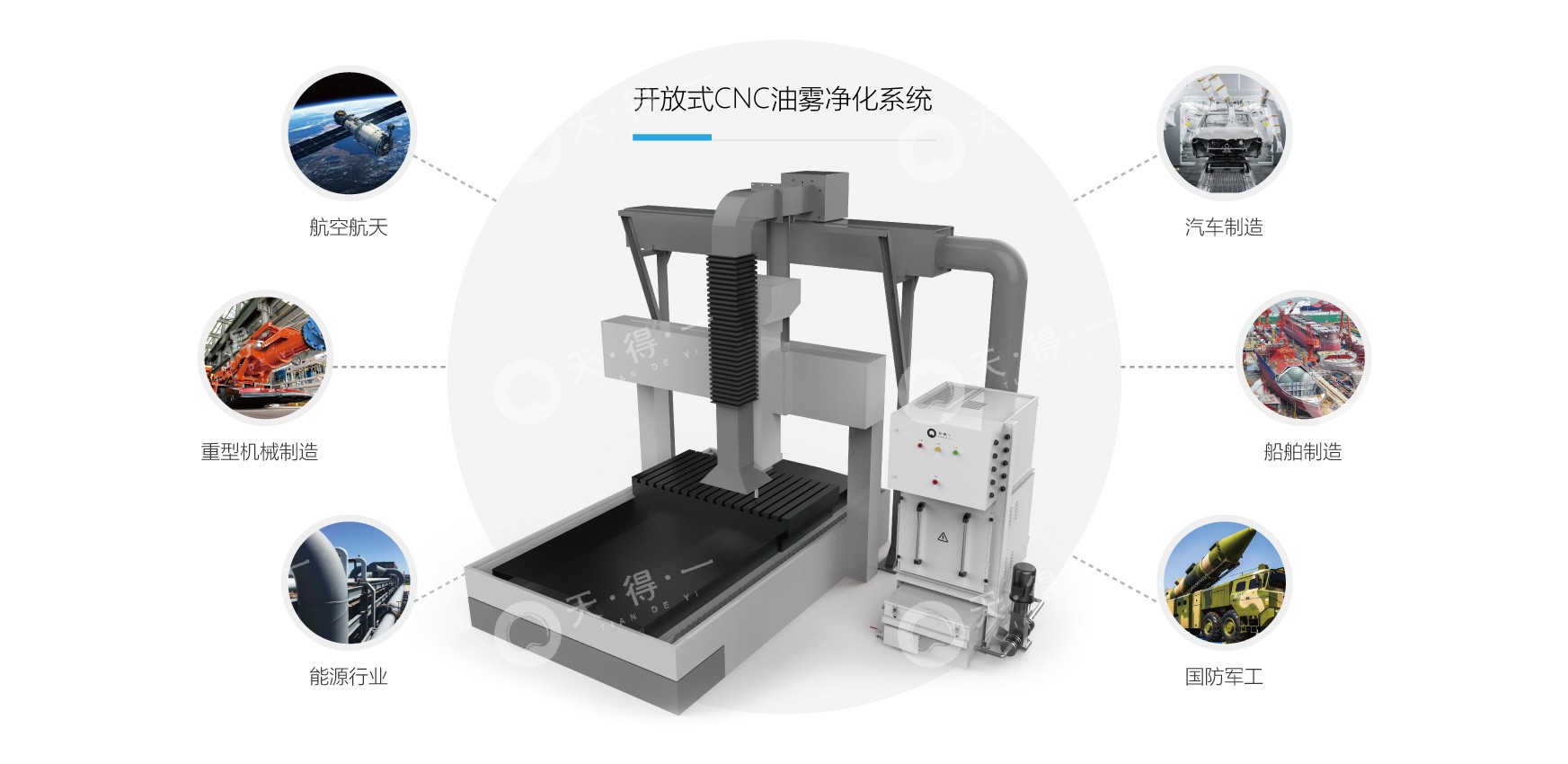 针对此类敞开式的油雾治理,可采用我司“大型CNC油雾治理系统”,可以满足龙门型、半敞开型、全敞开型等大型加工设备的油雾收集,我司自主设计开发的随动式油雾收集装置及配套的单机版油雾净化设备,可满足各类大型 CNC 设备的油雾收集和治理需求,实现油雾治理后直接在室内达标排放。