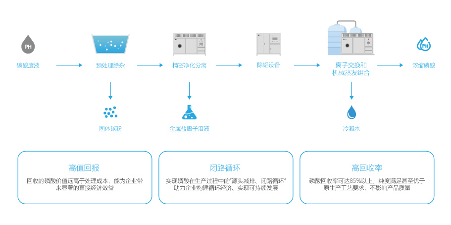 在半导体、显示面板的蚀刻工艺以及金属表面处理的磷化流程中,会产生大量含有杂质的废磷酸液。这些废酸若直接作为危废处理,不仅成本高昂,更是对宝贵磷资源的巨大浪费,同时,高浓度磷排放会引发水体富营养化,破坏生态平衡。本方案采用预处理-精密净化分离-除铝设备-低温蒸发设备的方式得到高浓度的磷酸,酸比重≥1.7,铝离子去除率≥70%,回收率≥80%,回用于车间。